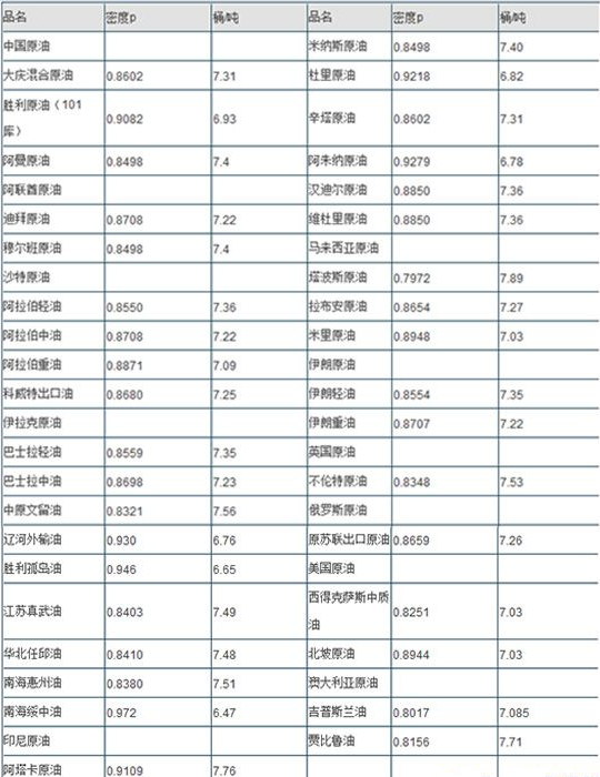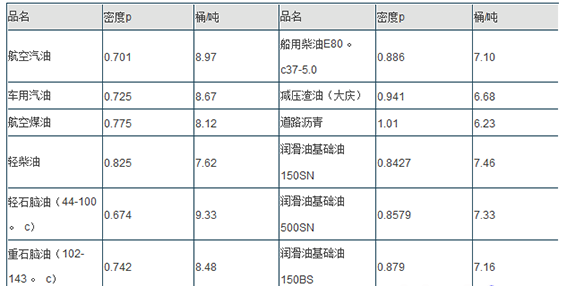 對石油產品的計算方法也是一樣。如某種汽油的密度為0.739,計算結果:1噸汽油等于8.51桶;某種柴油的密度為0.86,計算結果1噸柴油等于7.31桶。依此類推。表1列出了國內外常規(guī)油品及常見的原油的噸與桶的換算系數。